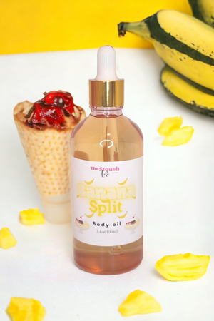 Indulge in a sweet treat for your skin with our Banana Split body oil! Infused with the calming effect of camomile and calendula flowers, this oil will leave your skin feeling nourished and hydrated. Perfect for a relaxing self-care routine or as a unique gift for a loved one. (No actual bananas were harmed in the making of this product.)